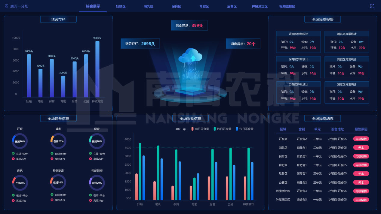在重慶琪金集團所屬的榮昌豬資源保護場和擴繁場中,老板只需在手機上打開南商云數據管理系統,通過簡單的操作后就可以清楚地了解豬場各方面的數據,比如設備運行狀態、豬只的采食數據、豬場能耗、溫濕度、豬只采食異常、設備異常、供料供水異常報警等都可一手掌握,還能一鍵下發飼喂方案: