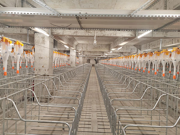 母豬一年要進(jìn)行2.4輪的生產(chǎn),每輪定位飼喂分在“配種定位欄”的約120天和在產(chǎn)床的約31天,目前的規(guī)模豬場基本上都是用自動供料線自動飼喂,飼養(yǎng)員只在定位欄和產(chǎn)床之間來回趕豬,以減少趕豬次數(shù)因而降低了工人的勞動強(qiáng)度。